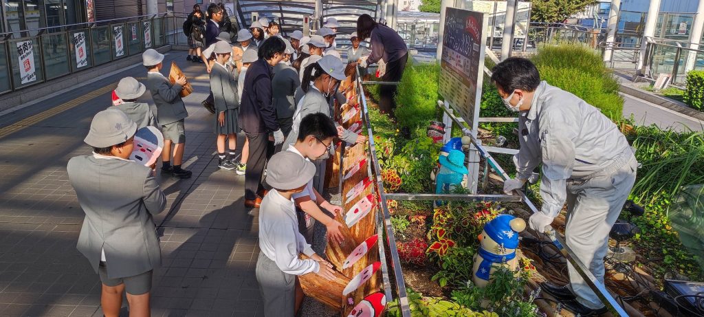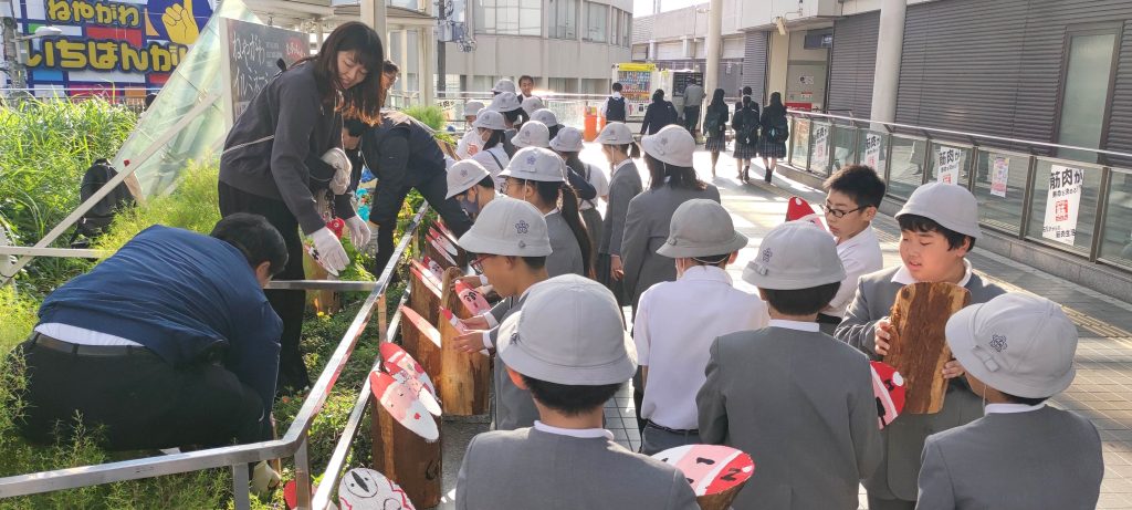 <2025.10.29 中央小学校児童が「切り株サンタ」を市駅前に設置しました>
