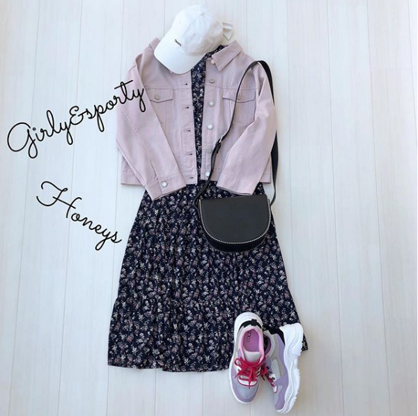 花柄ワンピとピンクのアウターを合わせた甘めテイストコーデをスポーティ小物で一気にストリートミックスに。