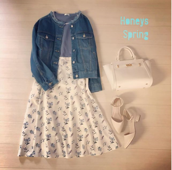 #Gジャン #ノーカラーGジャン #サックス #ブルー #ホワイト #白 #春アウター #Gジャンコーデ #モテコーデ #花柄スカート #スカートコーデ #パンプス #春 #春コーデ #spring #springstyle #Honeys #ハニーズ #fashion #R_fashion #ootd #プチプラ #高見え #置き画 #置き画くら部 #きょコ #ハニマニ