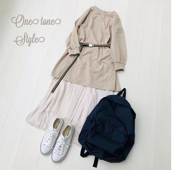 ベージュ×エクリュでワントーンコーディネート♡ チュニック丈のトップスはベルトでウエストマークして着こなして今年らしいスタイルに ライン入りのガチャベルト+リュックでスポーツMixなスタイリングの完成♡