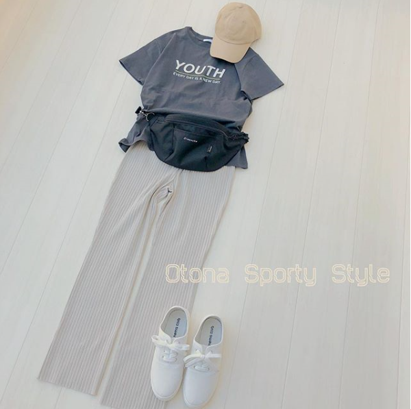 グレーやベージュのニュアンスカラーで合わせて大人なスポーティスタイルに♪