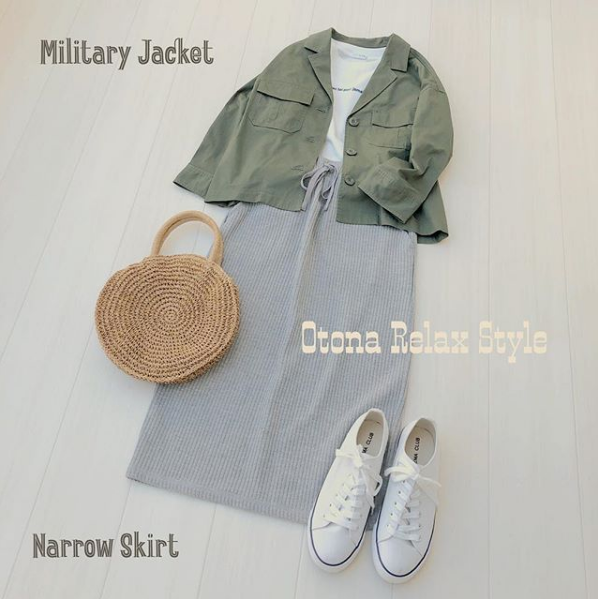 ワッフル素材のナロースカートにTシャツを合わせた大人リラックススタイル♡ シンプルコーデにミリタリージャケットをプラスでタウンユースにもおすすめなスタイリングに♡