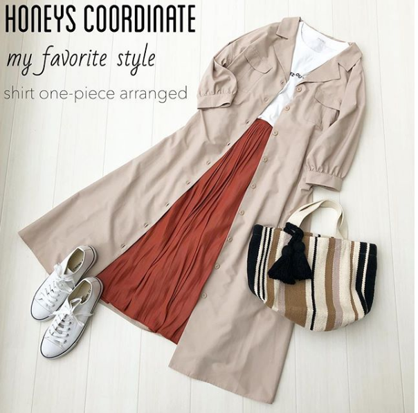 ベージュ×白の注目カラーコーデにポイントでオレンジを入れたオーガニックカラーコーデ。 トレンチ見えするシャツワンピがモード感をオプラスしてお出かけコーデにもおすすめな仕上がりに!