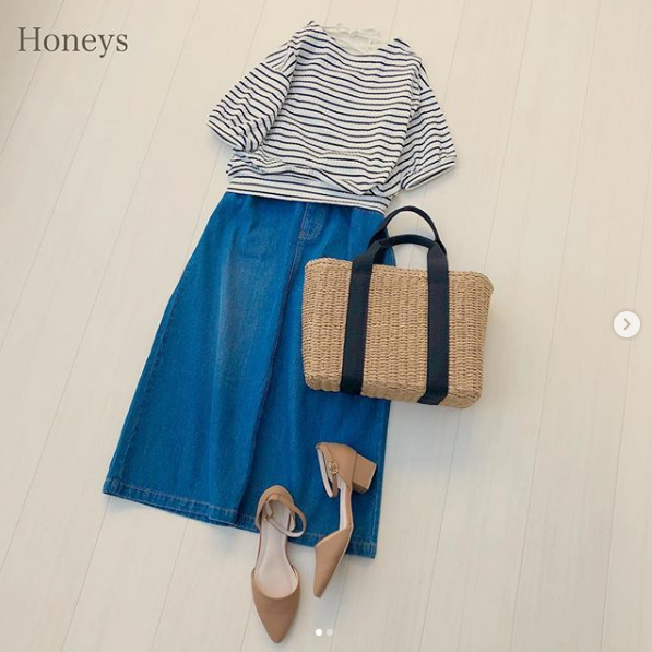 #ボーダー #トップス #デニム #Aライン #スカートコーデ #鉄板コーデ #レースアップ #春 #春コーデ #spring #springstyle#Honeys #ハニーズ #fashion #R_fashion#ootd #プチプラ #高見え #置き画 #置き画くら部 #きょコ #ハニマニ