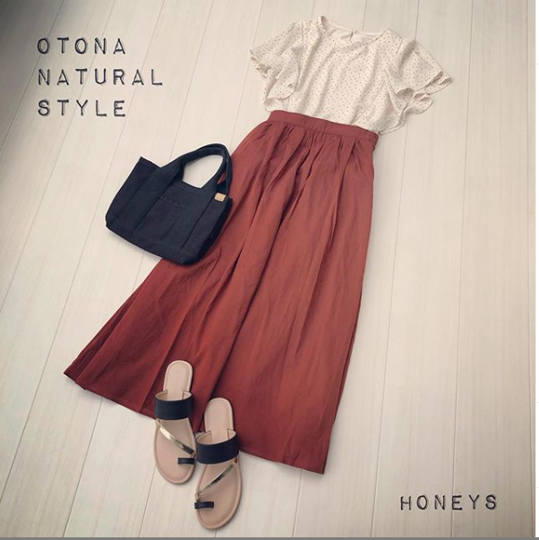 #フレア袖 #ドット柄 #ロングスカート #オレンジ #Orange #ミニトート #大人スタイル #ナチュラルスタイル #初夏 #夏 #夏コーデ #summer #summerstyle #Honeys #ハニーズ #fashion #R_fashion #ootd #プチプラ #高見え #置き画 #置き画くら部 #きょコ #ハニマニ