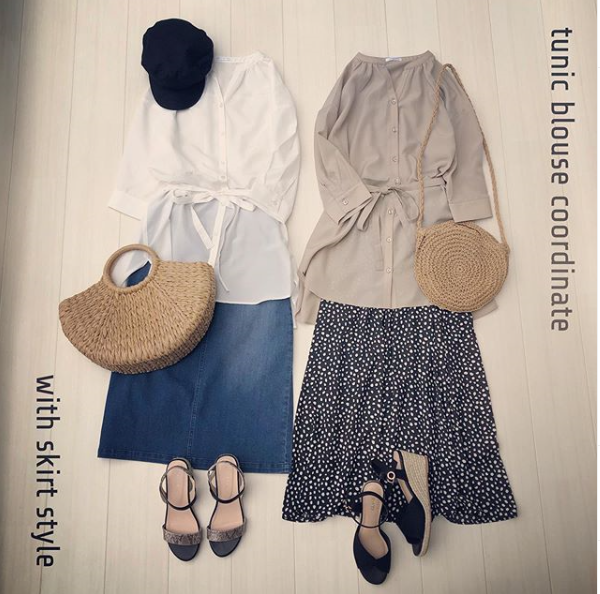 チュニック丈のブラウスをスカート合わせでコーディネート♡ デニムを合わせたカジュアルコーデ&ロングスカート合わせの今年っぽコーデ♡ ボトムを入れ替えての着こなしもOKなのでどちらの色も選んでもOK