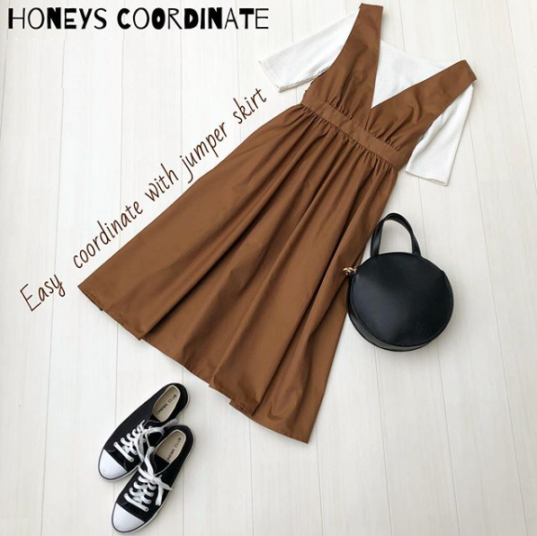 長め丈のジャンスカならカワイイも大人っぽいもかなうコーデの万能アイテム。リアルにカフェラテみたいなブラウンで今年らしさもプラス♡