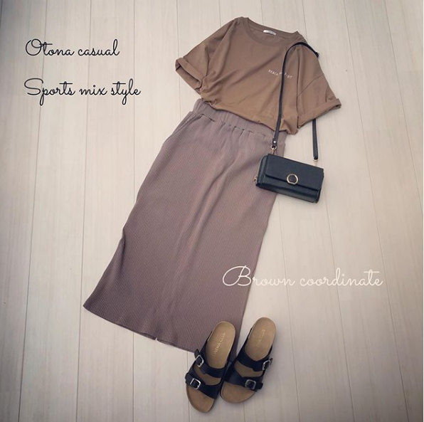 #ロゴT #Tシャツ #ナロースカート #スカートコーデ #ブラウン #大人カジュアル #スポーツmix #夏 #夏コーデ #秋 #summer #summerstyle #Honeys #ハニーズ #fashion #R_fashion #ootd #プチプラ #高見え #置き画 #置き画くら部 #きょコ #ハニマニ