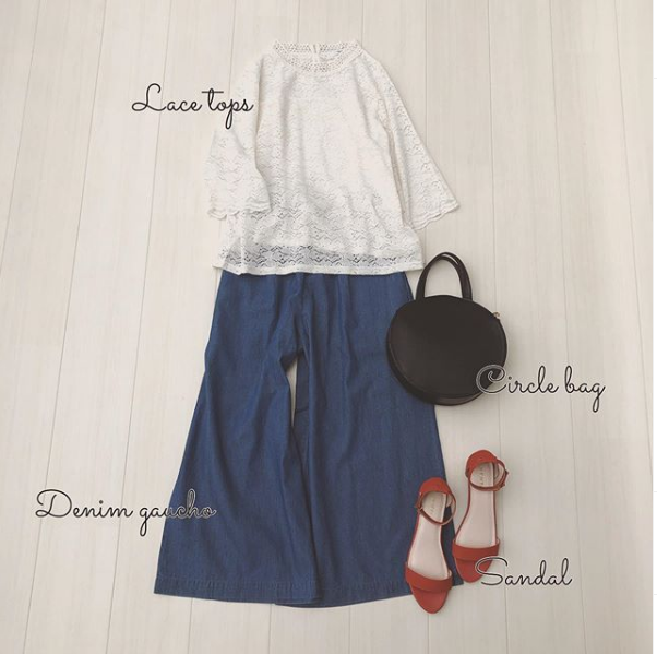 6分袖のレーストップスは透け感があるので今から使えて秋口までOK♪ レースとの相性がいいデニムボトムを合わせて差し色にオレンジのサンダルをチョイス♡