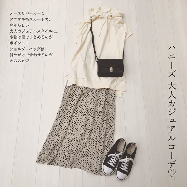 ノースリパーカーとアニマル柄スカートで、今年らしい大人カジュアルスタイルに。 小物は黒でまとめるのがポイント! ショルダーバッグは斜め掛けで合わせるのがオススメ♡