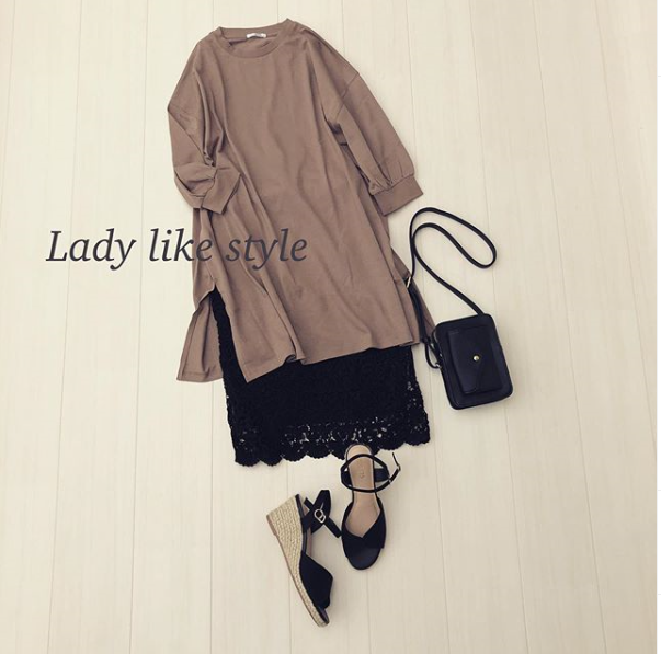 ボリューム袖のTシャツチュニックをレースのタイトスカート合わせでレディライクにコーディネート♡