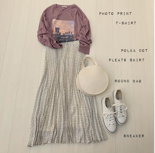 フォトプリントのTシャツはニュアンスカラーを選ぶのがオススメ♡ ベージュのプリーツスカートを合わせてやわらかな印象のコーディネートに♡
