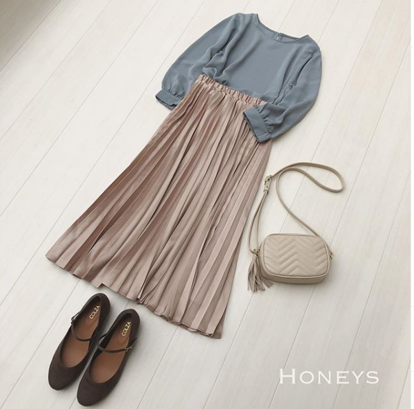 スカートやBagもくすみカラーなので足元に濃いめの色を合わせてコーディネートのアクセントに☆