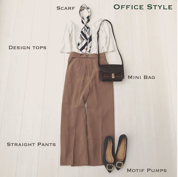 アシメネックのトップスをキレイめスタイルにコーディネート♡ パンプスとスカーフの柄に入ってる色でキレイ色をプラス スカーフは首に巻く以外にもヘアアクセとしてもGood!