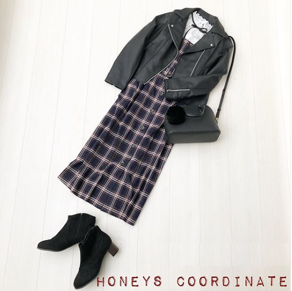 ハードなライダースにチェックジャンスカを合わせてガーリィをミックス♡長め丈のジャンスカが大人っぽさも出してくれてGOOD!