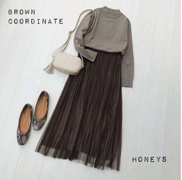 #ハイネック #チュールスカート #スカートコーデ #brown #ブラウン #ワントーン #初秋 #秋 #秋コーデ #Honeys #ハニーズ #fashion #R_fashion #ootd #プチプラ #高見え #置き画 #置き画くら部 #きょコ #ハニマニ