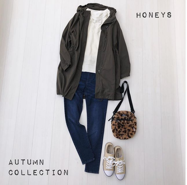 #ミリタリー #カーキ #ロングジャケット #ニットベスト #レイヤード #ヒョウ柄 #ファーBag #初秋 #秋 #秋コーデ #Honeys #ハニーズ #fashion #R_fashion #ootd #プチプラ #高見え #置き画 #置き画くら部 #きょコ #ハニマニ