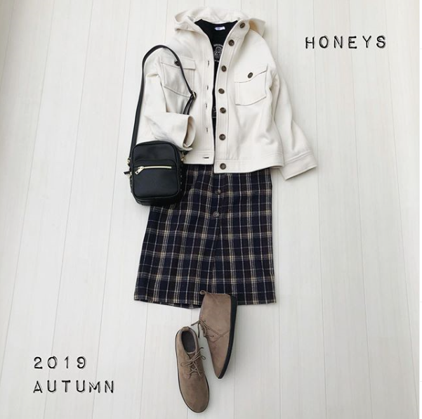 #フードブルゾン #Tシャツ #ロンT #チェック柄 #ナロースカート #スカートコーデ #秋 #秋コーデ #autumn #autumnstyle #Honeys #ハニーズ #fashion #R_fashion #ootd #プチプラ #高見え #置き画 #置き画くら部 #きょコ #ハニマニ
