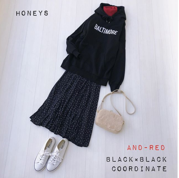 #ロゴパーカー #パーカ #裏起毛 #ハニぽか #リブタートル #ウォッシャブル #ダイナホット #プリーツスカート #スカートコーデ #赤 #冬 #冬コーデ #winterstyle #Honeys #ハニーズ #fashion #R_fashion #ootd #プチプラ #高見え #置き画 #置き画くら部 #きょコ #ハニマニ