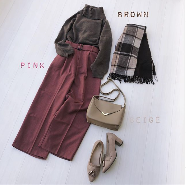 ブラウンのニットを主役にしたキレイめスタイル♡ ピンクのセンタープレスパンツで大人な雰囲気のコーディネートに チェック柄ストールはチェックと無地のリバーシブルなのでコーデによって使い分け出来るのもうれしい♪