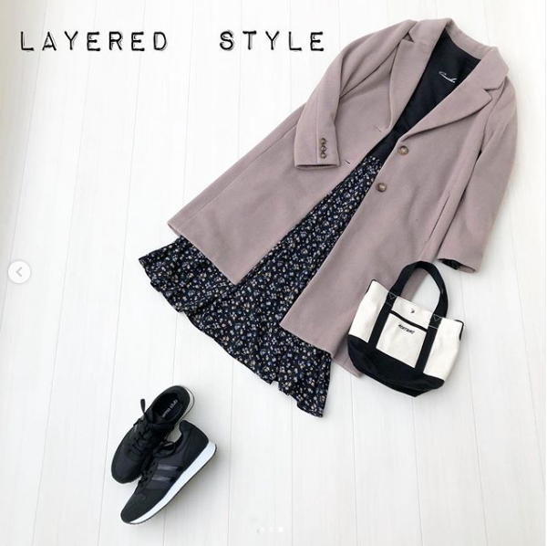 後レースアップがかわいいデザインのトレーナー。インにワンピースを合わせて技ありレイヤードスタイルに。 モカやクロを使ったコーデで花柄でも甘すぎず、大人っぽい印象のカジュアルコーデに。