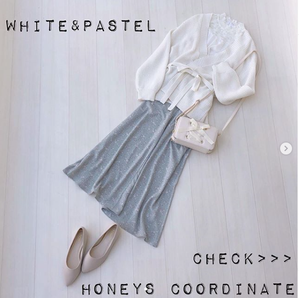ホワイト×パステルが春ムードたっぷりなスカートコーデ。