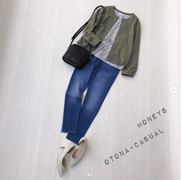 #ブラウス #小花柄 #モノトーン #ペプラム #カーキ #春アウター #カーキ #デニム #スキニー #大人カジュアル #春 #春コーデ #spring #springstyle #Honeys #ハニーズ #fashion #R_fashion #ootd #プチプラ #高見え #置き画 #置き画くら部 #きょコ #ハニマニ #ハニジョ