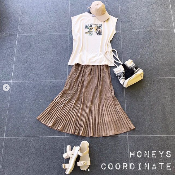 フォトTをワントーンで大人に、トレンドライクにコーディネイト。 動くたびに揺れるプリーツスカートがカジュアルな中にも女の子っぽさを演出。